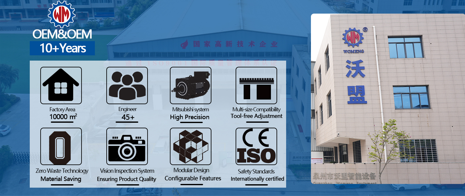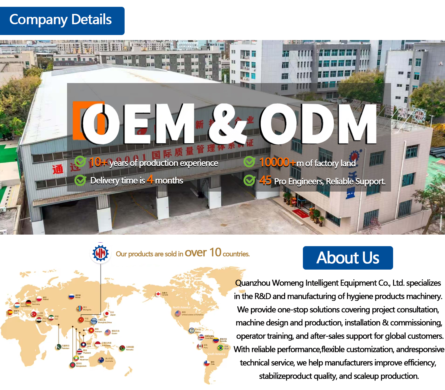 Quanzhou Womeng Intelligent Equipment Co., Ltd. is a trusted diaper production machine line manufacturer, established in 2016 in Quanzhou—East Asia’s cultural hub and the origin of the Maritime Silk Road. We focus on the development, production, and sales of high-efficiency diaper machines and related equipment.
